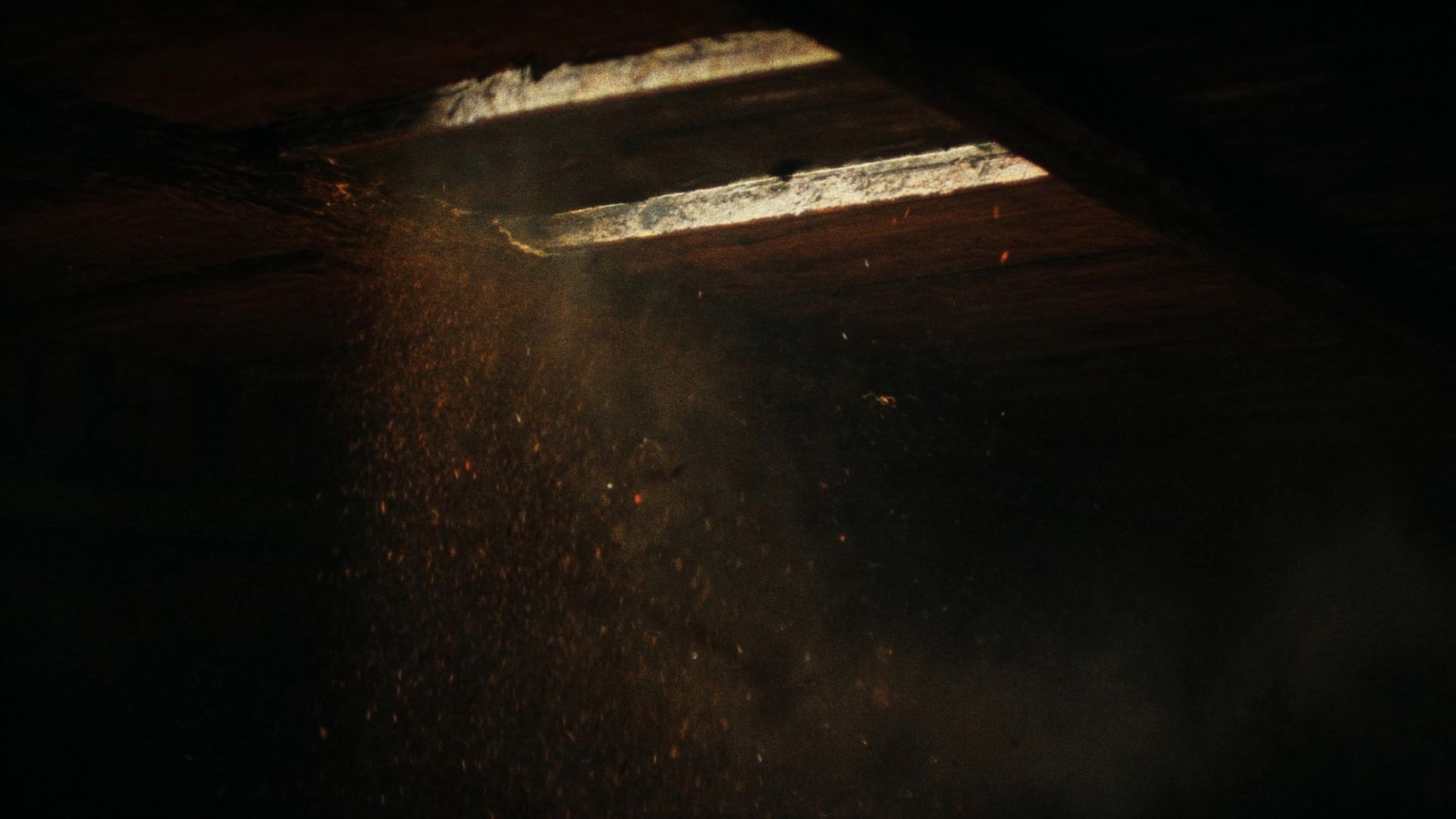 Dust falls as the strained groaning of wooden planks draws eyes to the ceiling. Small points of light break through the roof slats.